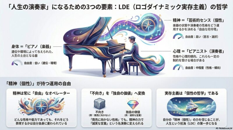 「性格や能力がどうあれ、それをどう弾きこなし、どういう曲調で人生を表現するかは、あなたの『精神(芸術的センス)』に委ねられているのだ」と。
