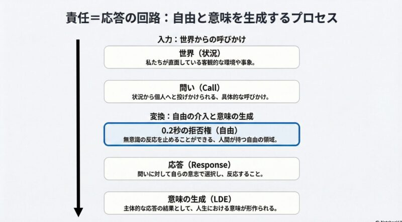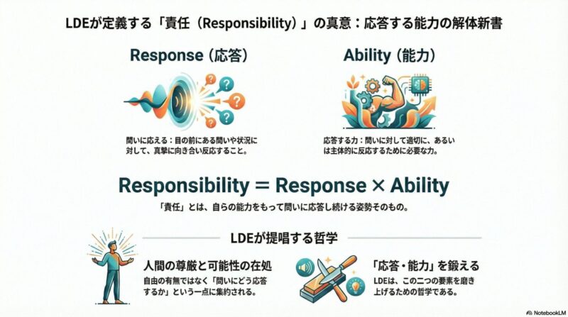 LDEにおいて、責任とは抽象的な概念ではなく、一人ひとりが置かれた固有の状況――それがたとえ病苦であれ、営業現場の拒絶であれ、人間関係の軋轢であれ――に対する**「具体的な応答義務」**を指します。