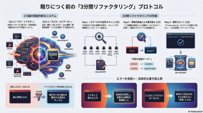 $ sudo commit -m "今日という人生の一行を、納得して受け入れる。" - 効果: これにより、未解決のタスク(未処理の不安)が「アーカイブ済み」となり、脳のワーキングメモリが解放され、深い眠り(システム・スリープ)へ移行できます。