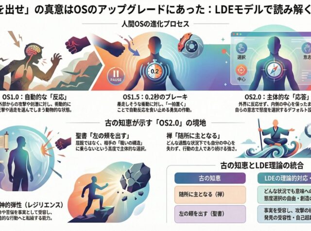 現代の高度情報化社会において、私たちの精神は絶え間ない「外部刺激」という名のノイズに曝されています。 SNSでの誹謗中傷、職場での些細な衝突。 それらに対し、私たちはまるで旧式のプログラムのように、怒りや不安という「自動反応」を返してしまいます。 しかし、聖書が説く「右の頬を打たれたら左の頬を出す」という一見不可解な教えと、禅の「随所に主と成る(いかなる場でも主導権を握る)」という哲学は、システム工学の視点で解読すれば、一つの完成された「高次アルゴリズム」として統合されます。 本稿では、心理学、脳科学、宗 ...