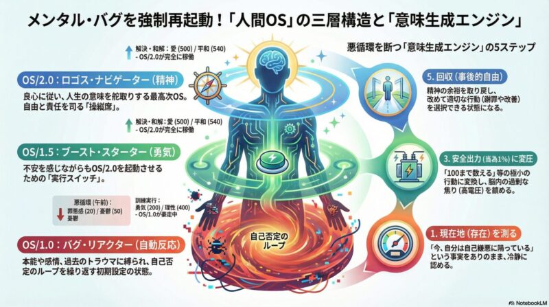 | ② 自己否定的悪循環 | OS/1.0「バグ・リアクター」の暴走 過去の行為に囚われ、自分を責める「フォースの領域(罪悪感や羞恥)」への陥落。「精神の筋力」が低下し、実存的空虚に引きずり込まれそうになる状態。 |