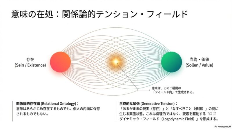 意味は、現在の「存在(Sein)」と、あるべき姿や呼びかけとしての「当為(Sollen)」の間に生じる「ロゴダイナミックな緊張(Logodynamic Field)」によって生成されます。