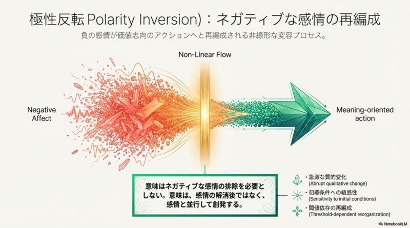 極性反転とは、負の感情(苦悩、怒り等)が意味志向の行動へと再構成される非線形な変容プロセスです。