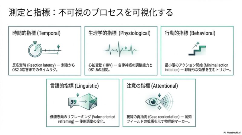 - 時間的指標(反応潜時): 刺激から反応までの間に生じるマイクロ秒単位の「間(OS 1.5)」の測定。