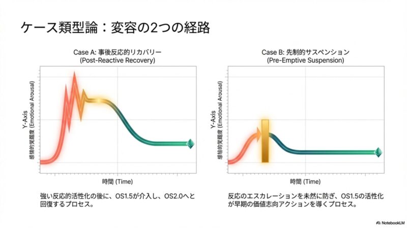- Case A: 事後的な反応的回復: 一度OS 1.0が爆発し、情動的な反応が発現した後に、OS 1.5を介してOS 2.0へと戻るプロセス。