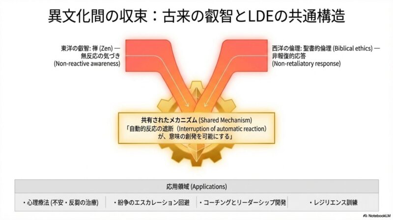 禅における「非反応的な自覚(Awareness)」や、聖書の倫理に見られる「報復の連鎖を断つ応答」は、LDEの観点からは、OS 1.5による自動反応の遮断と、OS 2.0による価値の再生成として説明可能です。