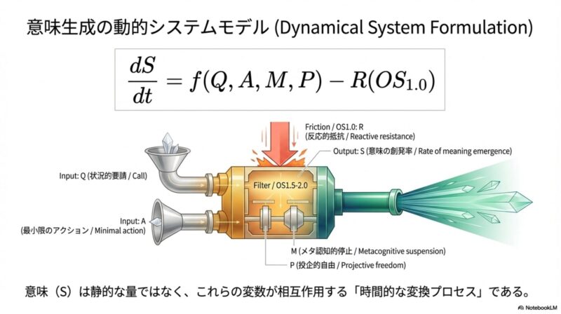 意味生成を「静的な量」ではなく「時間的な変容プロセス(dS/dt)」として捉え直すことは、実存的危機の理解にパラダイムシフトをもたらします。
