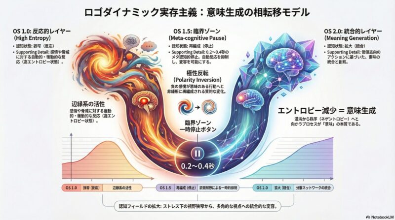 これは単なる中間層ではなく、自動的な反応(OS 1.0)を一時停止させ、価値に基づく選択(OS 2.0)へと移行するための「決定的な転移ゾーン」です。