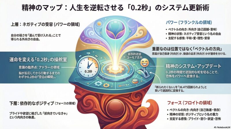 このマップが提示する衝撃的な事実は、私たちが追い求めてきた「ポジティブ」が実は自分を縛り付ける重力(フォース)であり、避け続けてきた「ネガティブ」こそが、真の自由(パワー)へと至る上昇気流であるという「逆転の構造」です。