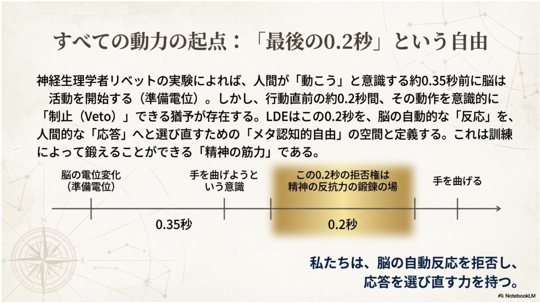 「ロゴダイナミック実存主義(LDE)においては、フランクルの「精神の反抗力」を「精神の筋力」として捉え直し、このリベットの0.2秒の「拒否権」の聖域を、精神の筋トレ道場して扱います。