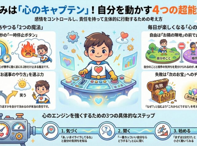 1. はじめに:君という船のハンドルを握ろう ねえ、キャプテン。ちょっと想像してみて。 君はいま、キラキラ輝く大きな海の真ん中に浮かぶ、一隻の船に乗っています。 その船の名前は「自分の人生号」。 いま、その船のハンドル(舵)を握っているのは誰かな? 先生? お父さんやお母さん? 違うよね。 ハンドルを握り、どこへ進むかを決めるのは、他の誰でもない「君自身」なんだ。 この本は、君が立派なキャプテンとして荒波を乗り越えるための「魔法の航海図」です。 ここで学ぶことは、テストのための退屈なお勉強じゃありません。 ...