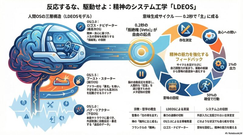 本稿では、心理学、脳科学、宗教哲学を統合した人間OSモデル「LDEOS 2.0」を用い、感情に支配される「反応体」から、自ら意味を定義する「人生の操縦士」へとシステムをアップグレードする実装方法を解説します。