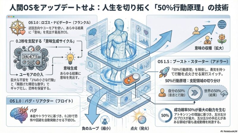 行動のハードルを劇的に下げる鍵は、アトキンソンの「達成動機理論」を実存主義的にハックした「50%行動原理」にあります。